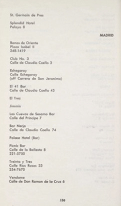 Los dos expedientes presentados hasta ahora comparten un esquema muy similar: ambos casos parecen indicar la existencia de una relación sexual entre una persona de origen estadounidense, mayor de edad y con una buena posición económica, con una persona española, más joven, que seguramente estaría ejerciendo el trabajo sexual o que buscaba un beneficio económico a través de esta relación.24 El turismo ejercía una influencia directa sobre el trabajo sexual de las ciudades, generando polos de atracción económica y modos de subsistencia para muchos jóvenes de clase obrera (Guasch 2016, 324). Esto no significa que el trabajo sexual fuera algo importado o surgido a raíz del incremento del turismo, pero sí que este tuvo un impacto directo sobre las dinámicas en las que ese trabajo tenía lugar y donde se desarrollaba. Por ejemplo, en el último caso, el ciudadano estadounidense había mencionado en su declaración que había conocido al chófer en el club Nerja. Este club aparece mencionado ya en 1965 en la International Guild Guide (figura 2), una guía de ocio y turismo gay publicada en Estados Unidos. En el caso anterior, el menor mencionaba el Club Bourbon Street, que aparecerá en esta misma guía, pero en su edición de 1968.