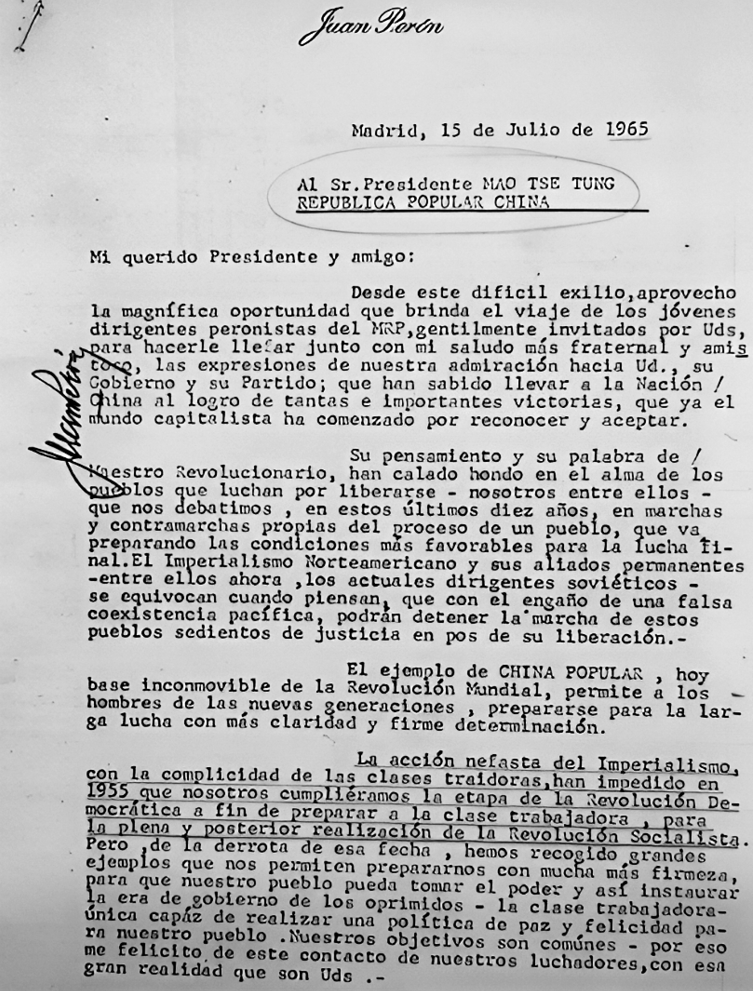 However, it was Perón’s well-known letter to Mao, dated July 15, 1965 in Madrid [image 1], that marked a significant shift in his position. In this letter, Perón explicitly told the Chinese leader that he was taking advantage of “the magnificent opportunity provided by the trip of the young Peronist leaders of the MRP [Revolutionary Peronist Movement]... to convey to you... our admiration for you, your Government and your Party.”10 He immediately acknowledged their shared struggle against “North American Imperialism and its permanent allies –including now the current Soviet leaders [author’s emphasis]”– and dismissed “peaceful coexistence” as deception. Notably diverging from his previous declarations and policies11, he analyzed that “the nefarious action of Imperialism, with the complicity of the traitor classes, prevented us in 1955 from completing the stage of the Democratic Revolution in order to prepare the working class for the full and subsequent realization of the Socialist Revolution.”