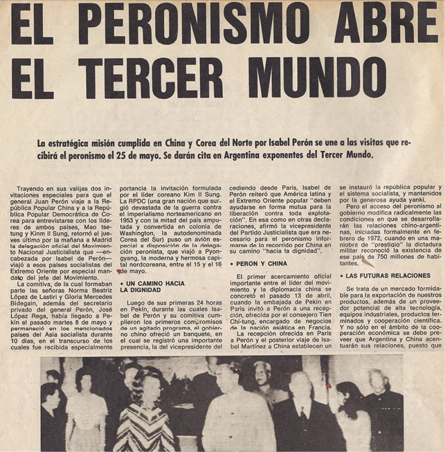 27 “El peronismo abre el Tercer mundo”, in El Descamisado 1, no. 1, May 22, 1973, p. 10. According to Gloria Bidegain’s account, the visit was semi-official in China, as they were guests of the Chinese Institute for Relations with Latin America, and official in Korea. “Una Compañera peronista en la tierra de Mao”, El Descamisado 1, no. 7, July 3, 1973, p. 20.