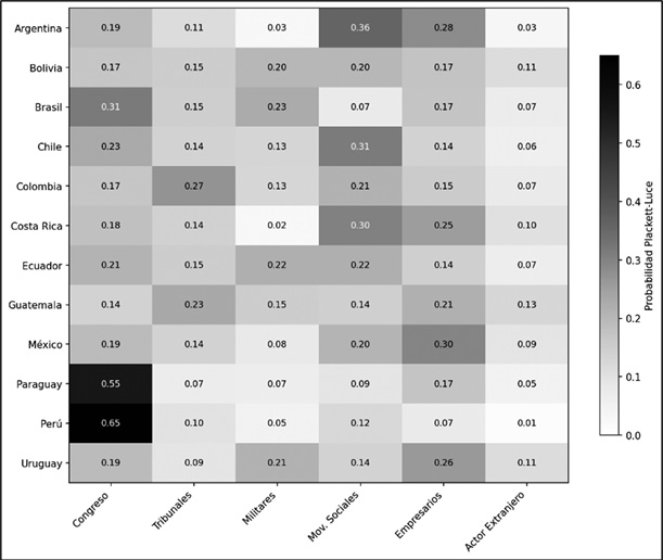 Al agrupar los actores según su carácter más institucional (Congreso y tribunales) o más societal (movimientos sociales y empresarios), también emerge un panorama matizado: los actores institucionales registran en promedio 0,41, mientras que los societales alcanzan 0,39. Colombia (0,27) y Guatemala (0,23) destacan por el rol protagónico de los tribunales, reflejando procesos de judicialización de la política que han condicionado la estabilidad de sus gobiernos. Por su parte, México (0,30) y Uruguay (0,26) sobresalen por el peso asignado a los empresarios, sugiriendo que en estos contextos el poder de veto o presión del sector privado es percibido como un factor más relevante de desestabilización.