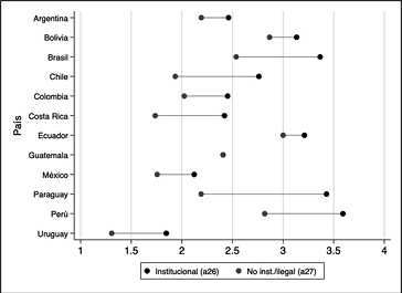 Los datos presentados complementan la literatura existente al mostrar que, en algunos países, los presidentes inician sus mandatos con mayor preocupación por no poder completar sus mandatos que en otros (ver figura 1). En segundo lugar, la breve revisión de la literatura que resume el rol de instituciones como el Congreso y la “calle”, esto es, movimientos sociales, es empíricamente examinada mediante las respuestas de expertos. El análisis Plackett-Luce muestra que el Congreso es efectivamente percibido como la principal amenaza a la estabilidad de los presidentes, especialmente en aquellos países con un registro de juicios políticos, pero cercanamente seguido por los movimientos sociales, específicamente en países donde estos han sido históricamente más activos. Por último, la comparación entre la probabilidad de recurrir a mecanismos institucionales versus no institucionales para destituir presidentes revela que, en la mayoría de los países, la oposición mantiene incentivos para actuar dentro de los cauces legales cuando estos están disponibles. Sin embargo, la disposición a recurrir a vías ilegales en varios países cuando las opciones institucionales se perciben como inviables plantea interrogantes sobre la solidez del compromiso democrático de las élites políticas en la región.