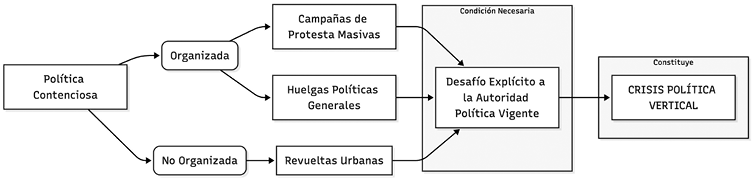 El centro del esquema destaca la condición necesaria que todas comparten: la existencia de un desafío explícito a la autoridad política vigente. Esta formulación permite diferenciar protestas que simplemente expresan descontento o que buscan promover políticas específicas de aquellas que buscan alterar la continuidad del gobierno. El diagrama muestra que tanto las campañas organizadas como las huelgas políticas generales y las revueltas urbanas pueden activar esta condición, aunque cada una lo hace mediante mecanismos distintos. Las campañas requieren masividad o episodios de violencia para volver viable el desafío, mientras que las huelgas generales y las revueltas urbanas poseen, por su propia naturaleza, un nivel de disruptividad suficiente para constituirse en una amenaza directa al Ejecutivo.